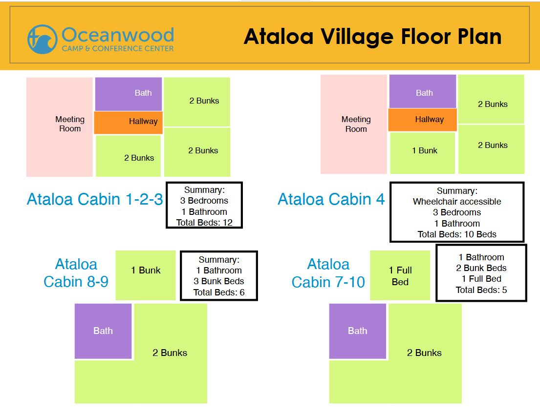 Looking for that coastal cabin vibe? Ataloa Village is the answer! Cabins range in size from two- three bedrooms, and are situated around an outdoor community fire pit. Perfect for sing-a-longs and s’mores! Ataloa Village is home to Lawton Lodge, a spacious and rustic meeting center ideal for worship services, seminars, or breakout sessions. Large Ataloa cabins have small kitchenettes and outdoor grills. All cabins have refrigerators and sitting areas. See downloadable floor plans for cabin size and capacity.
